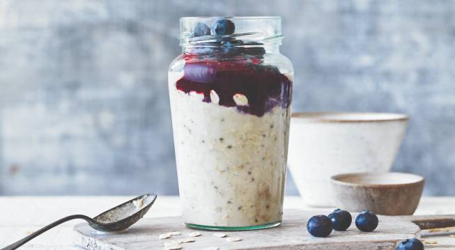 Laissez reposer au réfrigérateur toute la nuit pour faire gonfler et ramollir l’avoine. Puis dégustez à la cuillère directement dans le bocal.