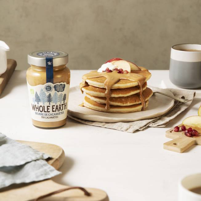 Disposez les pancakes (2 par personne suffisent généralement) sur des assiettes chaudes, recouvrez-les d’une cuillerée de yaourt grec et versez du beurre de cacahuètes sur le dessus. Coupez votre pomme en fines tranches au dernier moment pour éviter qu’elle ne brunisse et disposez les tranches sur le yaourt grec. Enfin, saupoudrez de grenade sur le tout.
